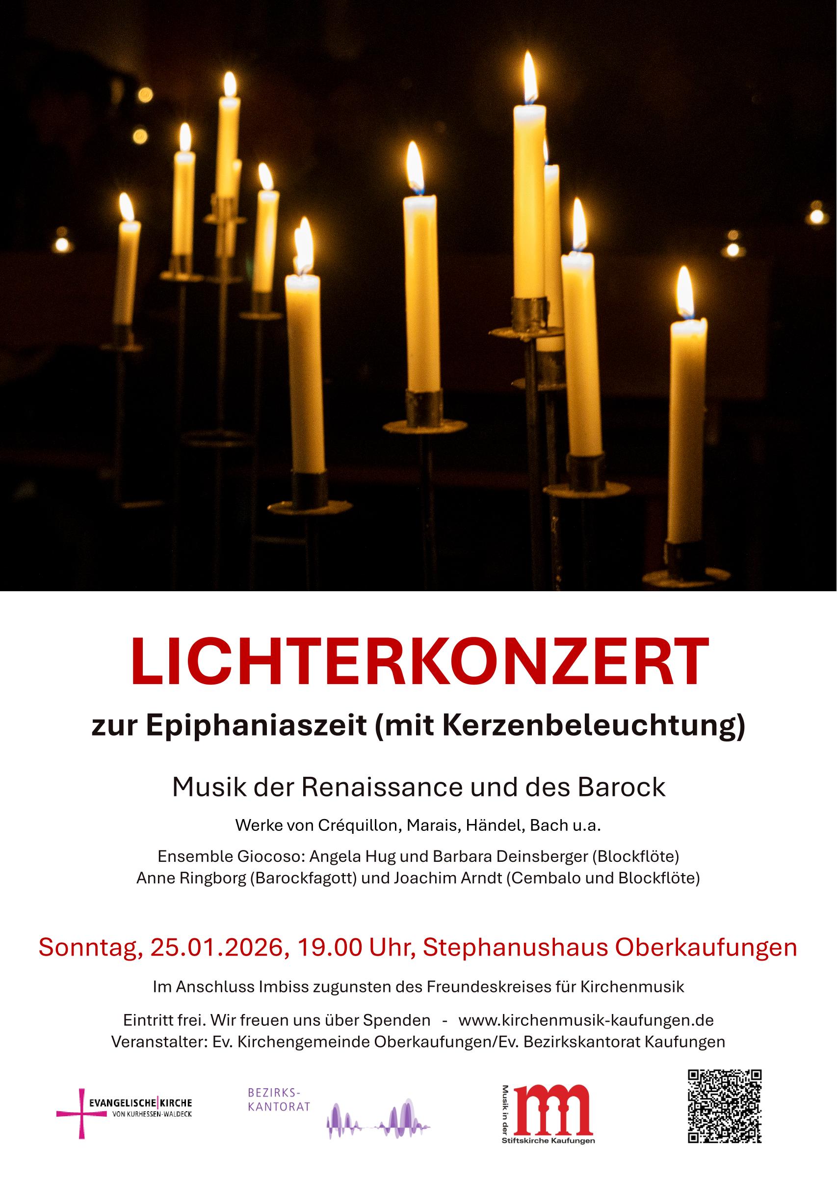 Ein Lichterkonzert mit Kerzenbeleuchtung rückt das neue Jahr am 26.01.26 in Oberkaufungen "ins rechte Licht". Hier der Flyer für den 25.01.26, 19 Uhr im Stephanushaus.